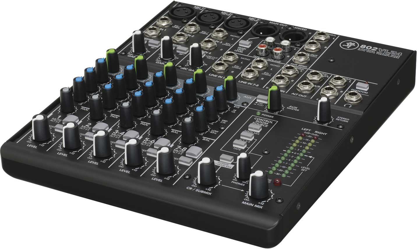 MESA DE MEZCLAS Mezclador Mackie 802VLZ4. La 802VLZ4 de 8 canales, con los previos insignia de Mackie Onyx, ofrece un diseño profesional de alto umbral/ bajo ruido, construcción ‘Built-Like-A-Tank’, todo en un formato ultra compacto ideal para escritorio. – 3 previos de micro Onyx, rango ultra amplio de 60 dB de ganancia, 128,5 dB de rango dinámico, entrad de linea + 22 dBu, respuesta de frecuencia extendida, distorsión inferior a los 0.0007% (20Hz – 50kHz). Rechazo RF mejorado, perfecto para aplicaciones broadcast. Alimentación Phantom para micrófonos de condensador. 8 entradas de línea de alto umbral. Entradas de instrumentos seleccionables en los dos primeros canales – sin necesidad de caja DI. EQ de 3 bandas (80 Hz, 2,5kHz, 12 kHz). Filtro corte de graves 18 dB / octava 100 Hz en los canales de entrada de micrófono. Envío AUX, nivel, Pan y PFL Solo en cada canal. Bus estéreo ALT 3/4 para una flexibilidad en el ruteo. Medidores estéreo de 12 segmentos de alta resolución. Controles giratorios sellados, resisten el polvo y la suciedad. Robusto chasis de acero ‘Built-Like-A-Tank’ con acabado de pintura en polvo. Fuente de alimentación universal para su uso en todo el mundo.