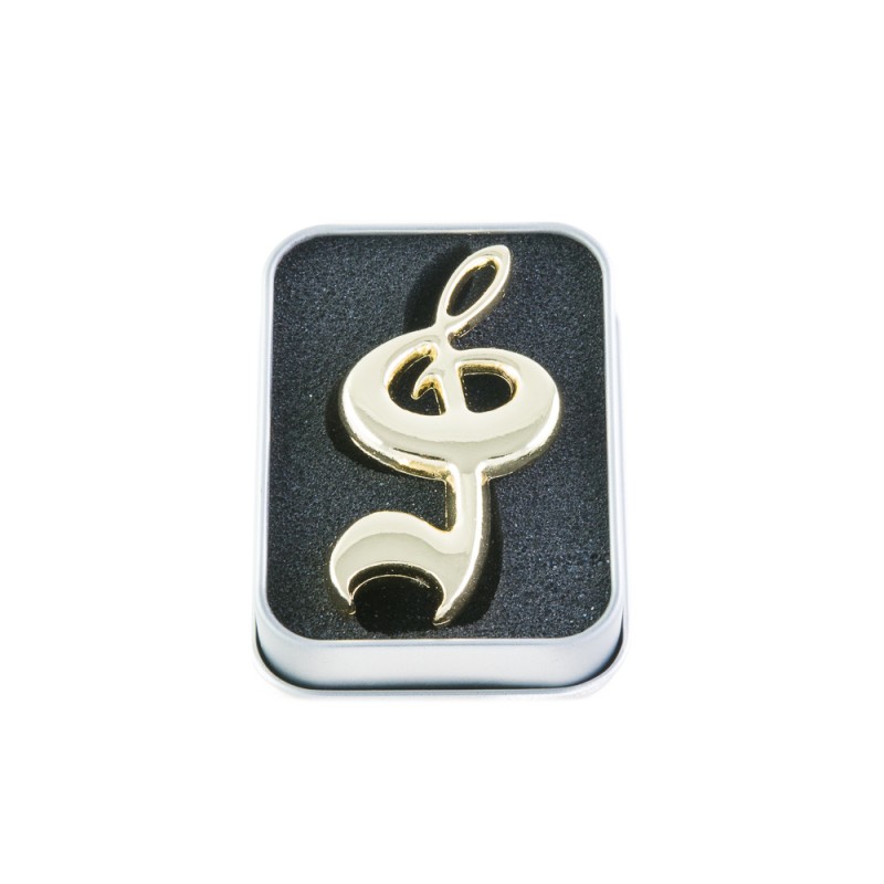 Abridor para botellas con forma de clave de sol en color dorado. Presentación en caja metálica.
