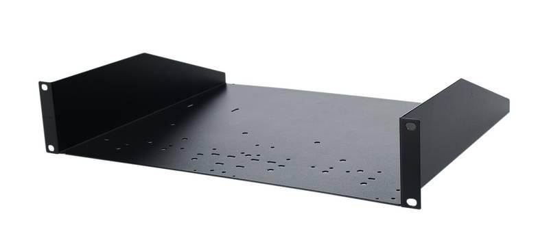 BANDEJA PARA RACK Bandeja universal con multi perforaciones 2U rack19». Placa de acero con espesor de 1.5 mm y huecos para adaptar equipos (menos los de 19′). Disponible con una profundidad de 371 mm. Color negro.
