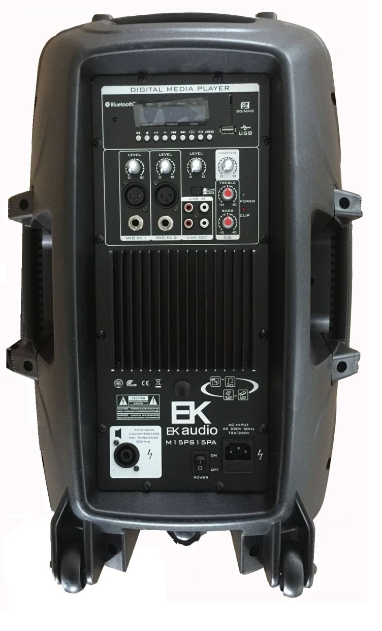 M15PS15PA COLUMNA ACTIVA EK AUDIO 800 W Altavoz de dos vías amplificado. Reproductor MP3 por puerto USB y SD Card. Conexión Bluetooth. Line IN/OUT. Selector Línea/MP3. Ecualización de agudos y graves. Salida Speakon a columna pasiva de 8 Ohm. Con mando a distancia. Potencia RMS: 200 W. Max: 800 W. Altavoz 15 . Dos canales con entrada XLR y Jack. Volumen: Canal 1 canal 2 Line/MP3 Master. Con ruedas. Medidas: 480mm x 740mm x 395mm. Peso: 13 kgs.