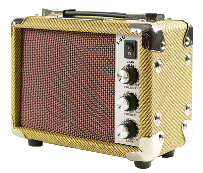 AMPTWD5U MINI AMPLIFICADOR DE UKELELE PORTATIL Potencia: 5W. Altavoz: 5” Controles: Volumen agúdos y graves. Salida para auriculares. Entrada auxiliar. 9 V polaridad inversa (interior negativo). Funciona con 2 pilas de 9Voltios (portatil) o enchufado a la red mediante adaptador de 9 voltios incluido. Acabado: Tweed (Tejido de lana). Medidas: 17.8 x 20.3 x 11.4 cm. Peso: 2 kg. No compatible con U•BASS®.