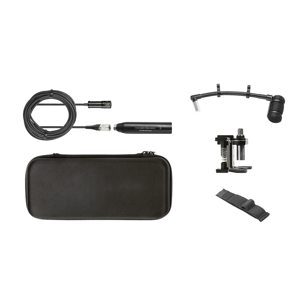 Micrófono cardioide de condensador para instrumento, con sistema de montaje universal: Micrófono ATM350a, flexo AT8490, soporte universal AT8491U, módulo de alimentación AT8543, caja de transporte, soporte velcro AT8468.