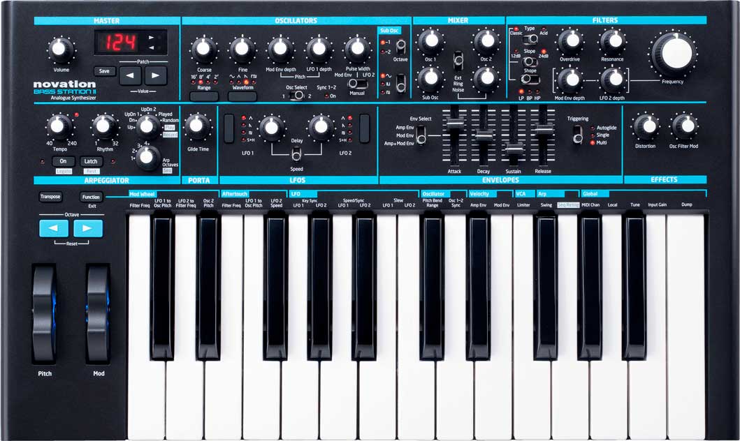 MODULO SINTETIZADOR El Bass Station II es un sintetizador monofónico analógico con el sonido clásico del legendario Bass Station original pero rediseñado para el S. XXI. Tiene dos filtros, dos osciladores junto a un sub-oscilador, almacenamiento de sonidos y una sección de efectos completamente analógica. Junto a un secuenciador por pasos, un arpegiador, teclas de tamaño completo y una potente sección de modulacióntiene todo lo que necesita un sintetizador para hacer no sólo bajos, tarea en la que destaca muy bien, sino muchos otros tipos de sonidos más. La ruta de señal de Bass Station II es analógica (incluyendo la sección de efectos). El hardware ha sido dispuesto en módulos con controles dedicados para los principales parámetros. Se puede almacenar hasta 64 sonidos e incluye de serie 64 sonidos preset. Es posible almacenar más en el ordenador. El teclado de 25 teclas de tamaño completo es sensible a la velocidad con aftertouch asignable. Dispone de E/S MIDI y MIDI por USB. Como además es un dispositivo Class Compliant funciona con cualquier equipo nada más conectarlo al ordenador. El motor de síntesis: Osciladores: Bass Station II tiene tresosciladores y un generador de ruido. Dos de los osciladores son completamente independientes y el tercero es un sub oscilador (componente crítico para crear sonidos de bajo analógicos ricos). La forma de onda de los osciladores 1 y 2 puede conmutarse entre senosoidal, diente de sierra, cuadrada y ancho de pulso. La forma de onda del sub oscilador puede ajustarse 1 o 2 octavas por debajo del oscilador 1 y ofrece formas de onda cuadrada y pulso con ancho estrecho, siendo capaz de ofrecer ese característico tono de bajo.
