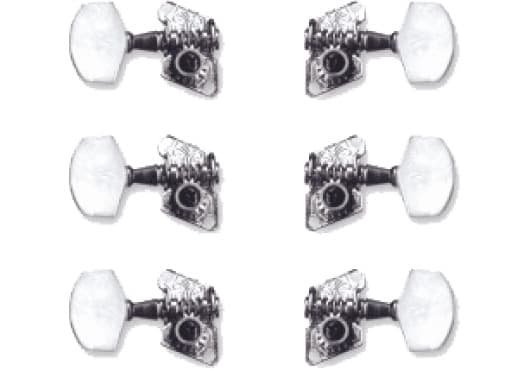 Clavijas para guitarra acústica con botones de plástico y partes metálicas de níquel.