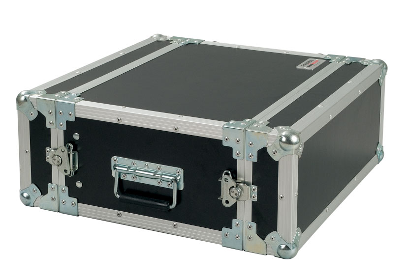 FLIGHT CASE PARA EQUIPO RACK 19′ Maleta para rack Proel CR104BLKM. Estuche rack 4U, 33 cm de profundidad. Madera contrachapada fenóli- ca-bond marino de 5 mm, laminado con recubrimiento resistente al rayado negro, bola de acero en las esquinas y perfiles de aluminio.