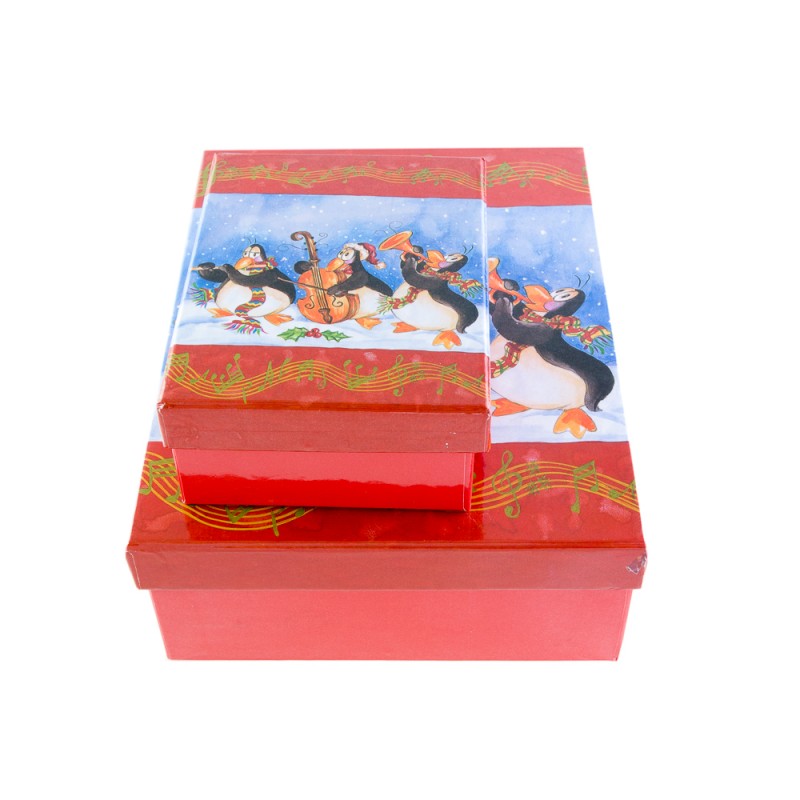 Set de dos cajas de cartón con motivos musicales navideños de pingüinos.