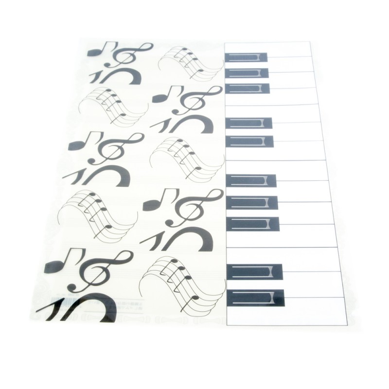 Dossier con dibujo de teclado de piano, partitura y notas musicales.