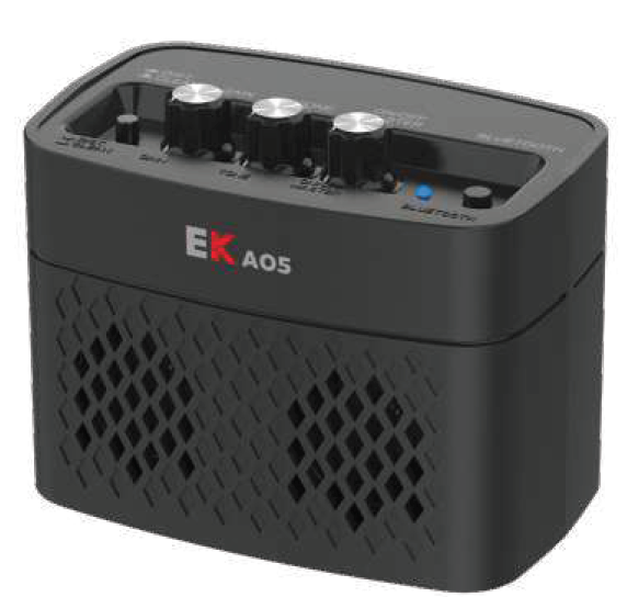 EKA05 Mini amplificador portátil y recargable para guitarra eléctrica. Bluetooth integrado. ESPECIFICACIONES Pico de salida: 5W Altavoz: 2*2 pulgadas Versión de bluetooth: 5.0 Rango dinámico: 96dB THD+N: 0 05 % Frecuencia de muestreo: 24 bits/ 44 1 kHz Batería: 7 4 V/2200 mAH Tiempo de carga completa: 3 5 h. Hora de trabajo después de recarga completa: 5 h. Dimensiones: 125 x 80 x 90 mm. Peso: 450 g. Artículos incluidos: . Cable USB tipo C x 1 . Manual del usuario.