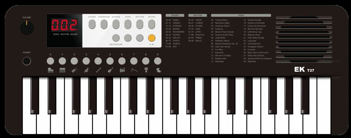 EKT37BK 37 teclas pequeñas. Pantalla LED. 100 Voces. 100 estilos de ritmos. 32 notas de Polifonía. Demo: 30 canciones. Sustain transpositor volumen synchro Start/Stop Intro/Fill in. Metrónomo. Salida de auriculares. 490 x 184 x 53 mm. Peso: 0 95 kg. Con alimentación por USB (5 Volt. ó 4 pilas AA).