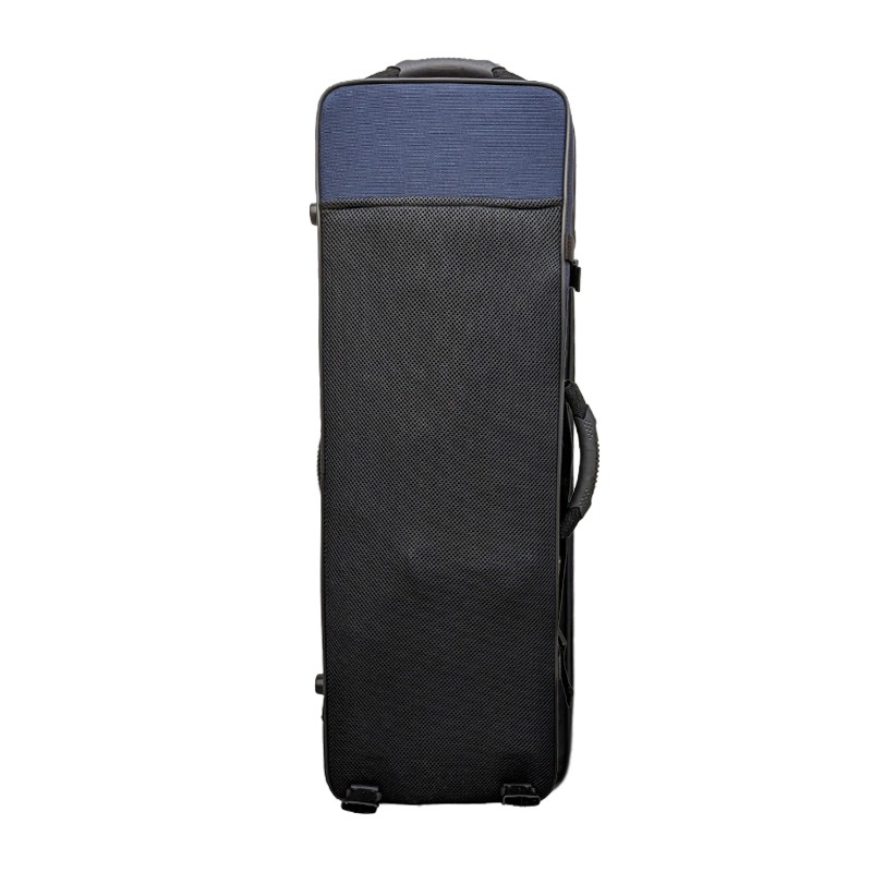 Estuche rectangular para violín con tejido exterior impermeable, correas tipo mochila y asa tipo metro. Interior con espacio para 4 arcos y tubos para cuerdas.