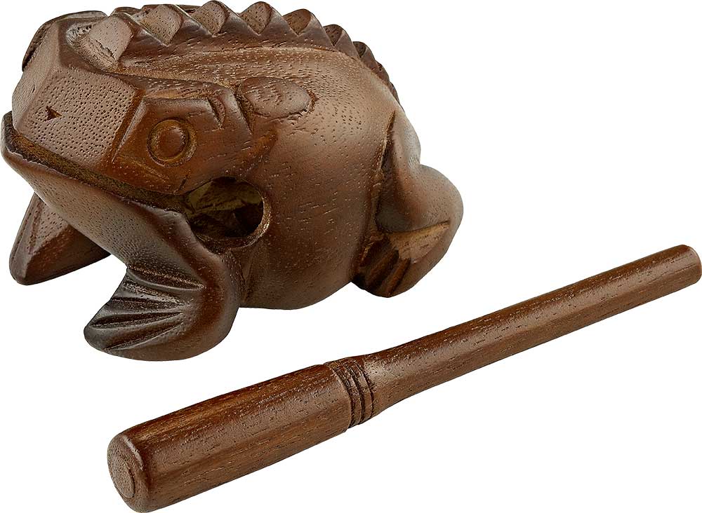 GUIRO Rana de percusión tamaño mediano color marrón FROG-M. Para tocarla como un bloque de madera o un güiro. Tono bajo. Raspador incluido.