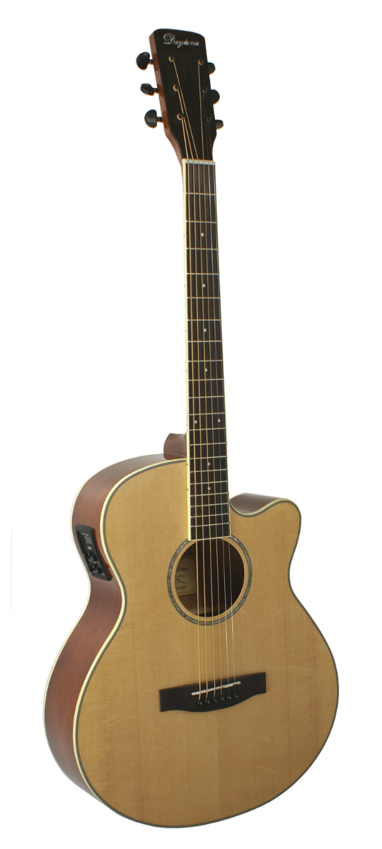 GADSTN Daytona GADST Mini Jumbo TAPA MACIZA Tapa: Abeto Macizo. Aros y fondo: Caoba. Ribetes: En tapa y fondo. Electrificada con Cutaway. EQ: H3T. Acabado alto brillo. Las imágenes publicadas pueden diferir ligeramente del producto final. Caja completa: 6 unidades.