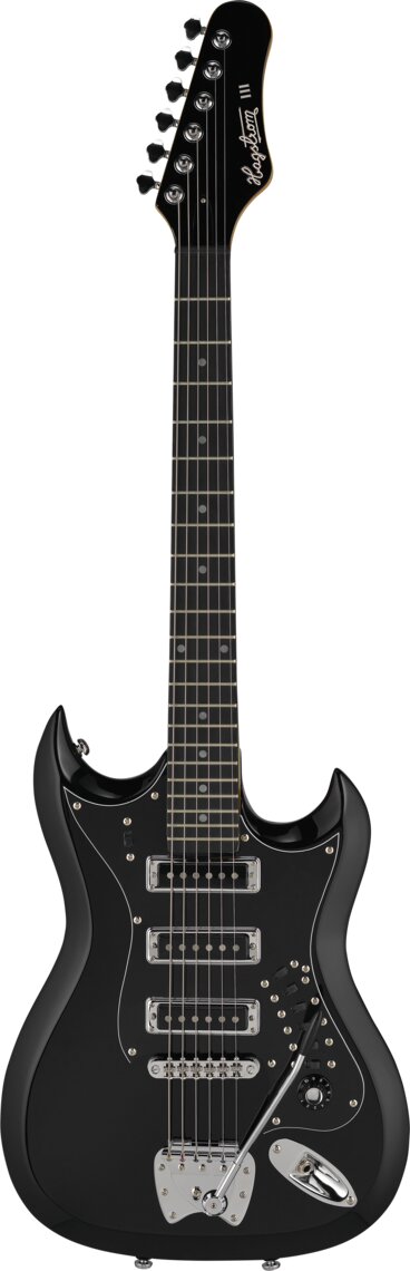 GUITARRA ELÉCTRICA RETRO ‘Retroscape – H-III – Black Gloss – Alder Body, Maple Bolt-On Neck, Roller T-O-M, Vintage Tremar, 3 x C-Spin SC Ceramic, 1 x Master Vol RC-Circuit, 6 x Slider Switches (Neck Pickup On/Off, Middle Pickup On/Off, Bridge Pickup On/Off, Master Tone On/Off, Mute On/Off, Top (Bass Cut) On/Off), 24.75» scale length, H-Expander Truss Rod, 15:1 Hagstrom Tuners, Resinator Fretboard’