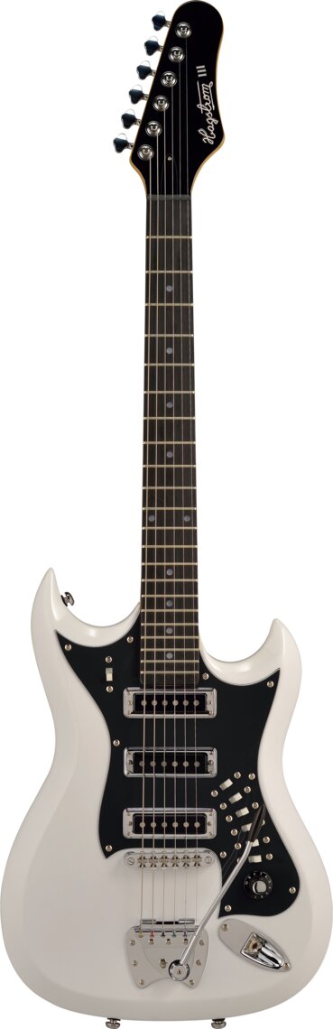 GUITARRA ELÉCTRICA RETRO ‘Retroscape – H-III – White Gloss – Alder Body, Maple Bolt-On Neck, Roller T-O-M, Vintage Tremar, 3 x C-Spin SC Ceramic, 1 x Master Vol RC-Circuit, 6 x Slider Switches (Neck Pickup On/Off, Middle Pickup On/Off, Bridge Pickup On/Off, Master Tone On/Off, Mute On/Off, Top (Bass Cut) On/Off), 24.75» scale length, H-Expander Truss Rod, 15:1 Hagstrom Tuners, Resinator Fretboard’