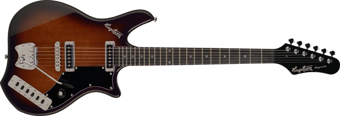 GUITARRA ELÉCTRICA RETRO ‘Retroscape – Impala – Brown Burst – Mahogany Body, Mahogany Set Neck, Roller T-O-M, Vintage Tremar, 2 x Retro-S Alnico 5, 1 x Master Vol RC-Circuit, 6 x Slider Switches (Neck Pickup On/Off, Neck Tone On/Off, Bridge Pickup On/Off, Bridge Tone On/Off, Mute On/Off, Top (Bass Cut) On/Off), 24.75» scale length, H-Expander Truss Rod, 15:1 Hagstrom Tuners, Resinator Fretboard’