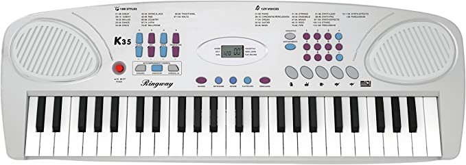 K35 49 TECLAS PEQUEÑAS Pantalla LCD multifuncional. 128 PCM voces + 1 set percusión. 32 notas de Polifonía. 100 estilos de ritmos. Sustain transpositor volumen. Synchro Start/Stop Intro/Fill in. Metrónomo entrada DC9V. Micrófono Midi por USB. 650 mm x 230 mm x 60 mm. Peso: 2 8kg. Con adaptador DC9V. Funciona con 6 pilas tipo C (LR14). Caja completa: 5 unidades.
