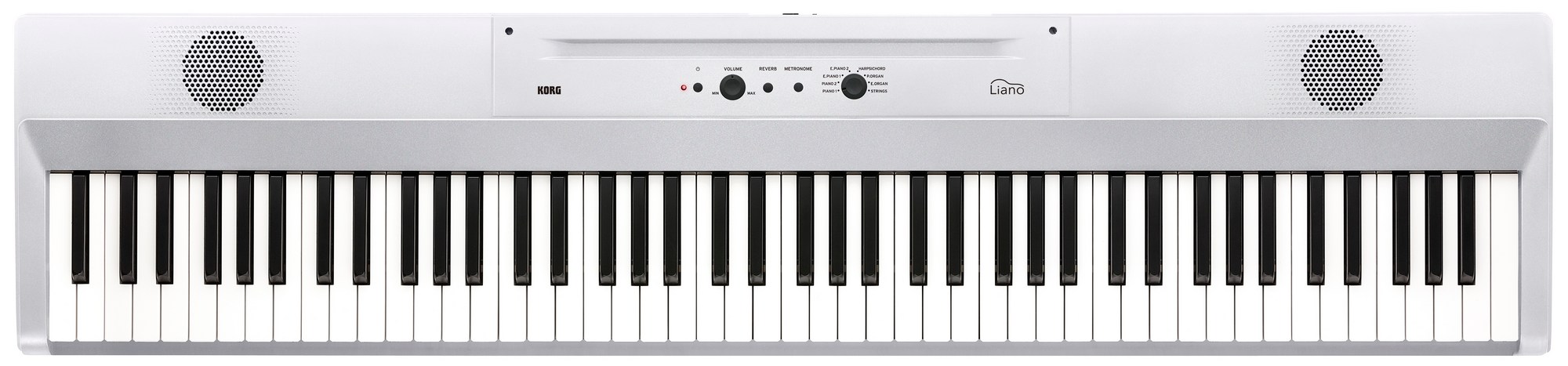 PIANO DIGITAL ‘El Liano es el nuevo piano digital compacto, delgado y ligero de Korg. Con solo 7 cm de grosor, 6 kg de peso y con un fantástico teclado semi-contrapesado procedente del potente Kronos LS, el nuevo Liano combina las ventajas de un teclado compacto y portátil con las prestaciones y funcionalidad de un piano. Características principales:– Teclado semicontrpaesado LS de 88 teclas (A0-C8)– 3 niveles de sensibilidad– Transpositor y afinación MASTER– 120 voces de polifonía máxima– 8 sonidos-Metrónomo– Altavoces circulares de 8 cm con sistema Bass Reflex– Potencia 2 x 8 W– Puerto MIDI USB– Conexión para pedal sustain– Toma de auriculares– Alimentación mediante adaptador incluido o 6 pilas AA (no incluidas)– Duración de las pilas: 8 horas aprox. (con pilas alcalinas)– Dimensiones: 1.282 x 290 x 73 mm (sin atril)– Peso: 6 kg.– Color: Blanco perla– Elementos incluidos: adaptador AC, pedal PS-3, atril.Ocho sonidos, al alcance de un dial.Las principales funciones del Liano son muy fáciles de entender. Gira el dial del panel frontal para cambiar rápidamente entre uno de los ocho sonidos, que incluyen piano, piano eléctrico, órgano, cuerdas y más: así de sencillo. La estrella entre los sonidos es un renombrado piano de cola italiano con un hermoso tono, un piano que aparece en conciertos de todo el mundo. El Liano incorpora dos efectos, una reverberación y un coro, que añaden riqueza al sonido.Altavoces Bass ReflexLos altavoces están situados en el panel frontal para dirigir el sonido directamente hacia ti. El altavoz Bass Reflex cuenta con puertos especialmente diseñados para proporcionar un sonido dinámico en bijas frecuencias que, de otro modo, sería difícil de producir. Y para practicar en silencio, también hay una práctica toma de auriculares.Puerto USBUtiliza el Liano por sí solo o conéctalo a un ordenador* y úsalo como teclado maestro para grabar música en tu software DAW, controlar una aplicación que ofrezca más sonidos de piano o ampliar la funcionalidad de Liano de cualquier otra forma.*Requiere cable USB (se vende por separado)Bundle de softwareEl Liano incluye un paquete de software para ayudarte a mejorar tu creación musical. Estas aplicaciones incluyen »»Skoove»» con varios niveles de lecciones de piano, »»KORG Module»» y »»KORG Gadget 2 Le»» para la producción musical basada en DAW, y un cupón de descuento del 50% para »»TuneCore»», una aplicación que te ayuda a vender tu música al mundo.Pedal y atril incluidosEl Liano incluye un pedal y un atril para partituras con los que podrás empezar a tocar de inmediato.‘