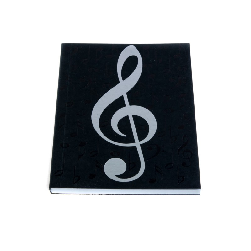 Libreta tamaño A6 con dibujo de una clave de sol grande y pequeñas notas musicales. Contiene 100 hojas.
