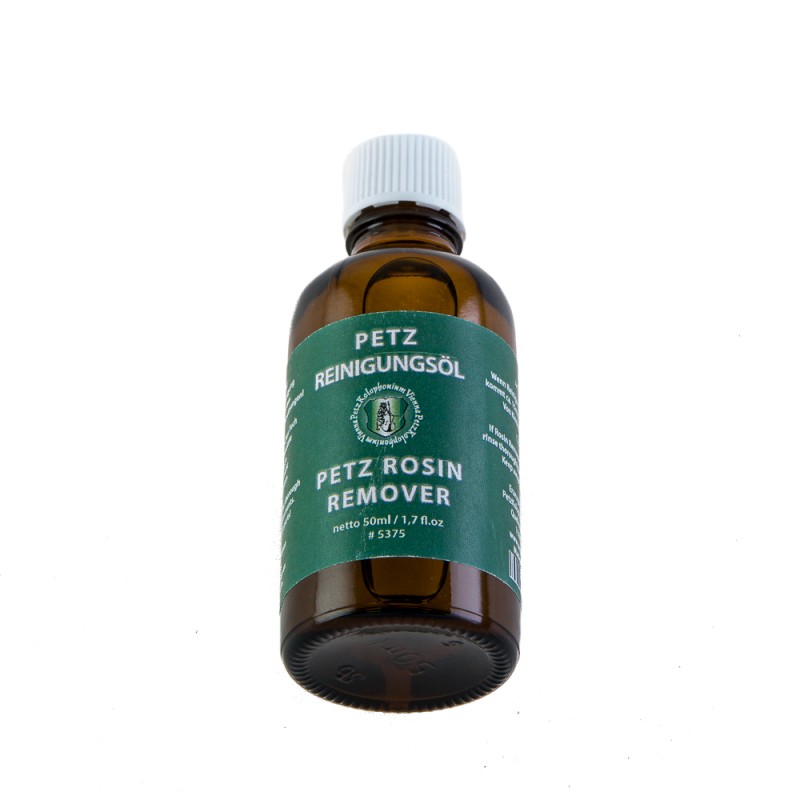 El polvo de resina es un peligro para la delicada superficie de los instrumentos de cuerda. El aceite de limpieza Petz es ideal para remover viejos restos de resina. Asimismo, sirve para quitar otras suciedades sin dañar la madera o el barniz.