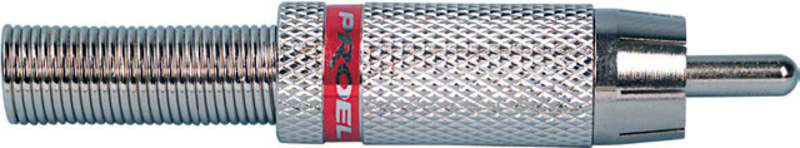 CONECTOR RCA Conector aéreo RCA macho con cuello en latón niquelado y muelle pasa cables flexible de 6,2mm. Anillo terminal en rojo.