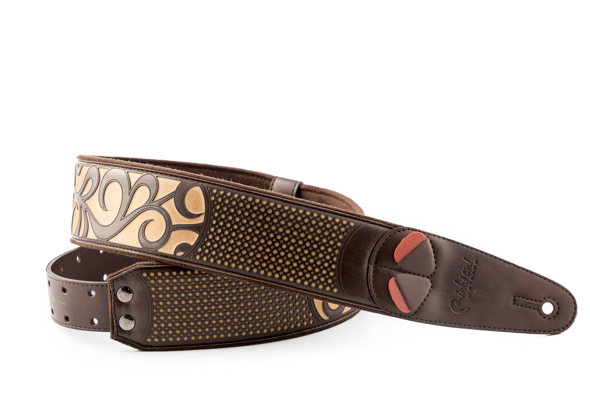 La correa NASHVILLE tiene una superficie que recuerda a antiguos grabados, las botas vaqueras, al trabajo manual, es una correa para la aventura. Esta correa evoca a la fuerza y a la persistencia en el tiempo, y lo consigue al estar fabricada en materiales de alta calidad Esta correa mide 6cm de ancho. Y cuenta con un largo comprendido entre los 95 y 145cm gracias al exclusivo sistema de ajuste de Righton Straps RAS (Righton Adjustment System) que permite ajustar la correa a la longitud deseada. Como en el resto de la colección MOJO, estas correas están fabricadas sin ningún tipo de crueldad animal y pueden presumir de ser correas veganas. La correa Nashville estáfabricada con materiales sint?ticos de alta tecnologa y con tejidos respetuosos con el medio ambiente. Los materiales han sido sometidos a diferentes pruebas para testar su resistencia, por lo que podemos garantizar la durabilidad de los mismosí Cuenta además con un forro de microfibra que no resbala y que repele el sudor. Esta correa estáacolchada, con 5mm de látex que hace que resulte muy cómoda y sea tambi?n muy ligera. En la punta delantera cuenta con dos pequeños bolsillos portapúas y en la parte trasera lleva dos «Fast pick dispender». Todas las correas RightOn! están diseñadas y fabricadas en España.
