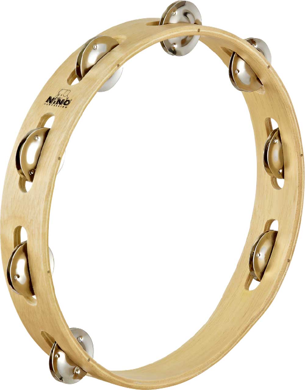 PANDERETA Las Panderetas de Madera NINO® cuentan con un marco de madera sólida, junto con un sonido brillante agradable. Están disponibles con una sola fila con 6 u 8 pares de sonajas de acero chapadas en níquel plateado, o con dos filas de 16 pares de sonajas del mismo material.
