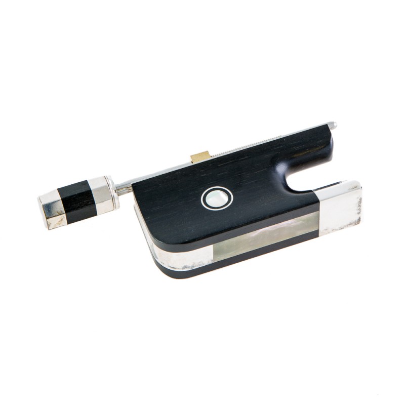 Nuez de ébano revestida para arco de contrabajo en sistema francés montada en plata. Tiene el ojo parisino y el Botón de tres piezas.