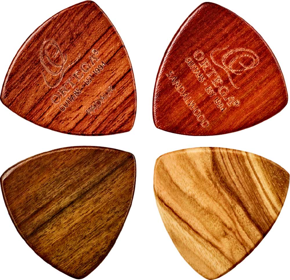 PACK DE PÚAS Pack de 4 puas de madera. Tamaño triangular XL con rebaje para pulgar y grosor de 2,5mm. Fabricadas a mano en 4 tiposd e madera: Ovangkol, padouk, sándalo y chacate.