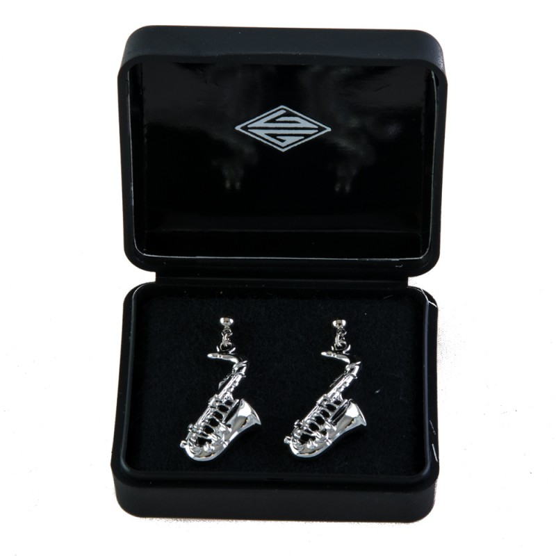 Pendientes plateados con detalle de saxo. Presentación en estuche.