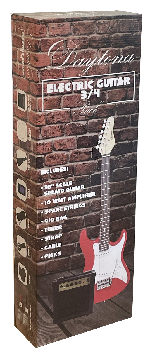PGEDBK34 El pack contiene: Guitarra Eléctrica Daytona ¾. Amplificador de 10W. Funda. Cuerdas Extra. Cable. Afinador. Correa. Púas. Las imágenes publicadas pueden diferir ligeramente del producto final.