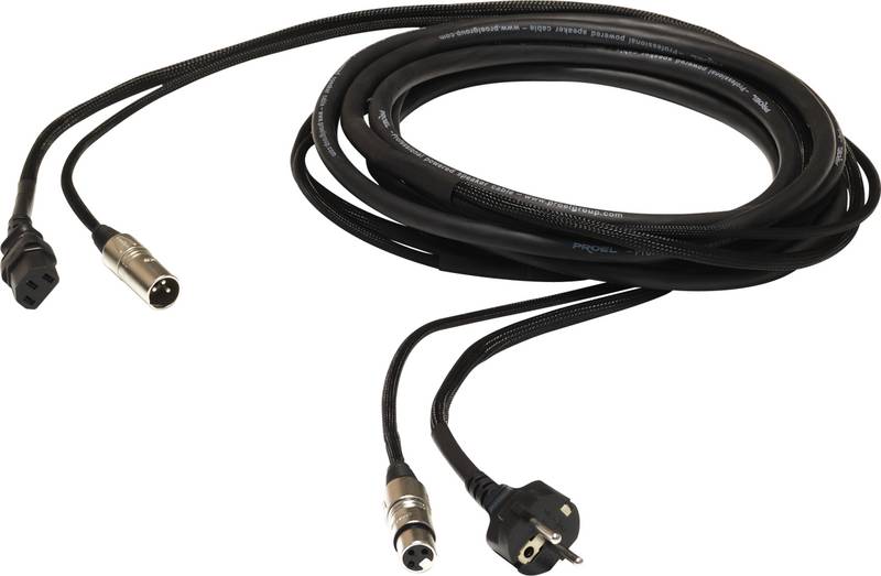 CABLE CORRIENTE Y AUDIO Cable Phono-Rete : en un mismo cable incropora tres conductores para corriente aislados individualmente y un par de conductores aislado para señal. Con conectores 16A Shucko y XLRh en un extremo y ECtripolar y XLRm en el otro. 20m.