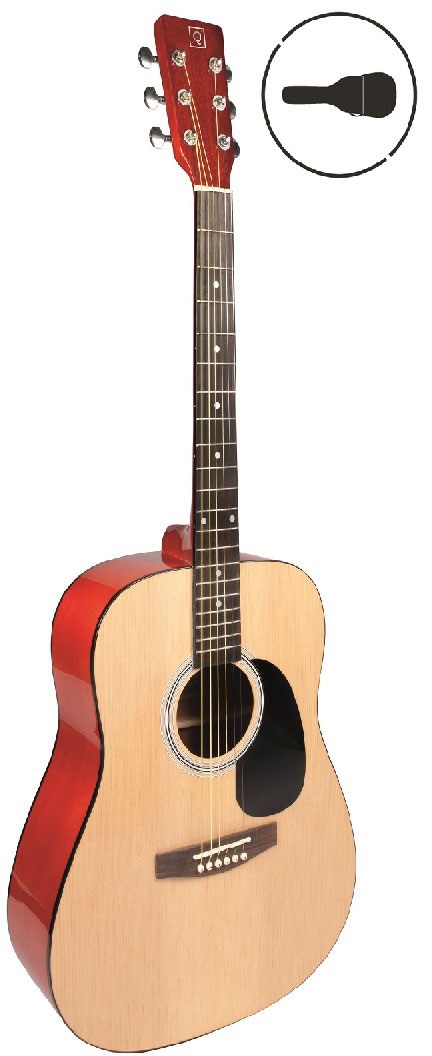 GUITARRA ACUSTICA DE 6 CUERDAS Guitarra acústica tipo dreadnought. Tapa de tilo.Aros y fondo de tilo. Mástil de arce. Diapasón y puente de ‘compound rosewood’. Clavijero Die-Cast cromado. Acabado natural. Funda incluida.