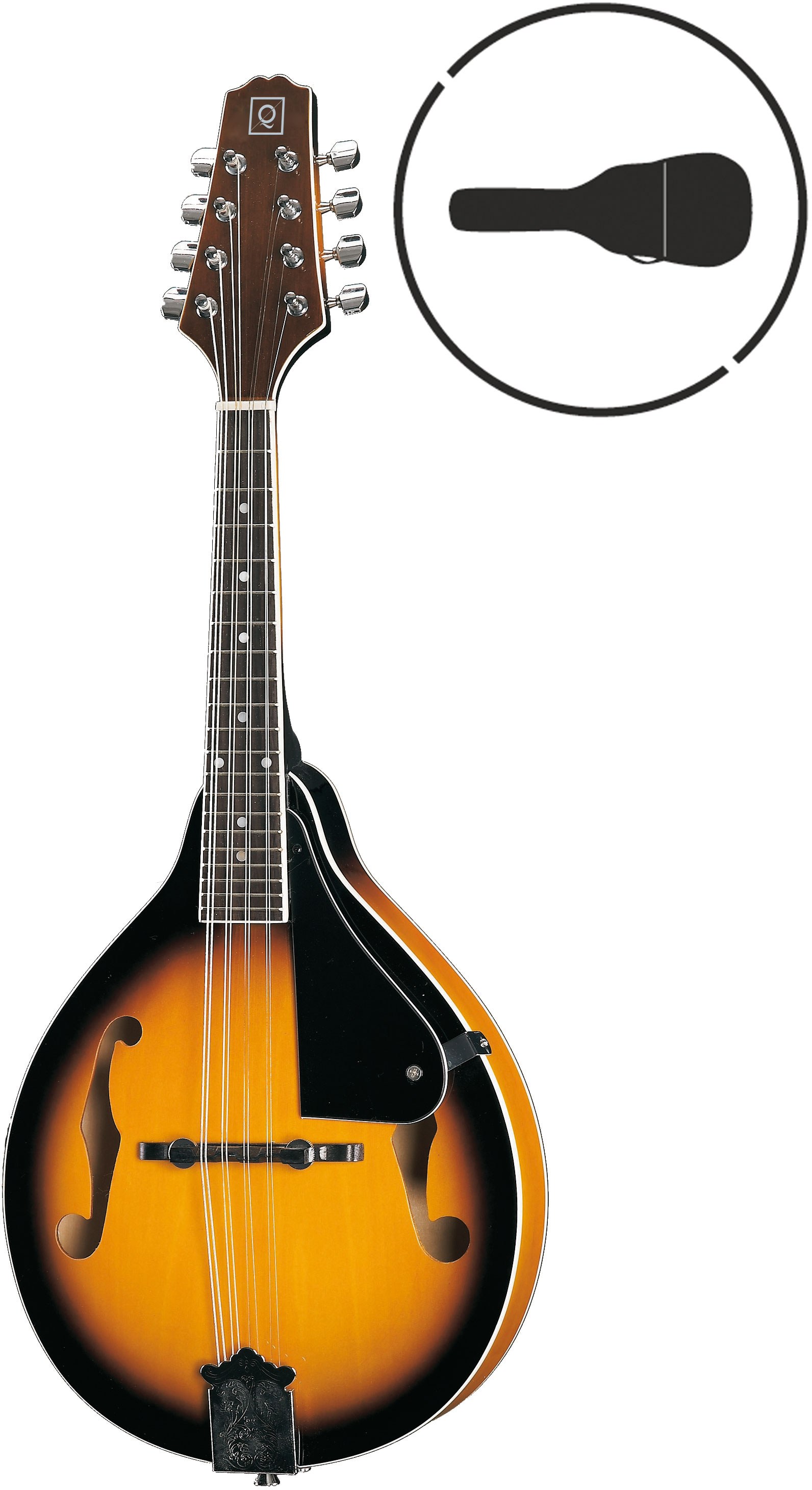 MANDOLINA Mandolina. Cuerpo en madera de tilo. Diapasón de ‘compound rosewood’. Binding blanco. Clavijeros cromados. Picador negro. Acabado vintage sunburst. Versión electrificada, con control de volumen y tono. Funda incluida.