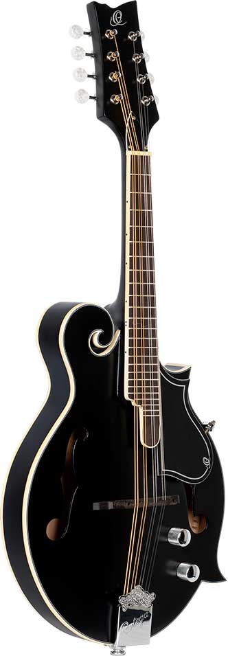 MANDOLINA Mandolina electrificada F-type. Tapa delantera de pícea. Tapa trasera de arce. Puente y diapasón de palisandro. 24 trastes. Pick-up piezo bajo selleta. Acabado: negro satinado / Binding blanco. Incluye funda y correa.