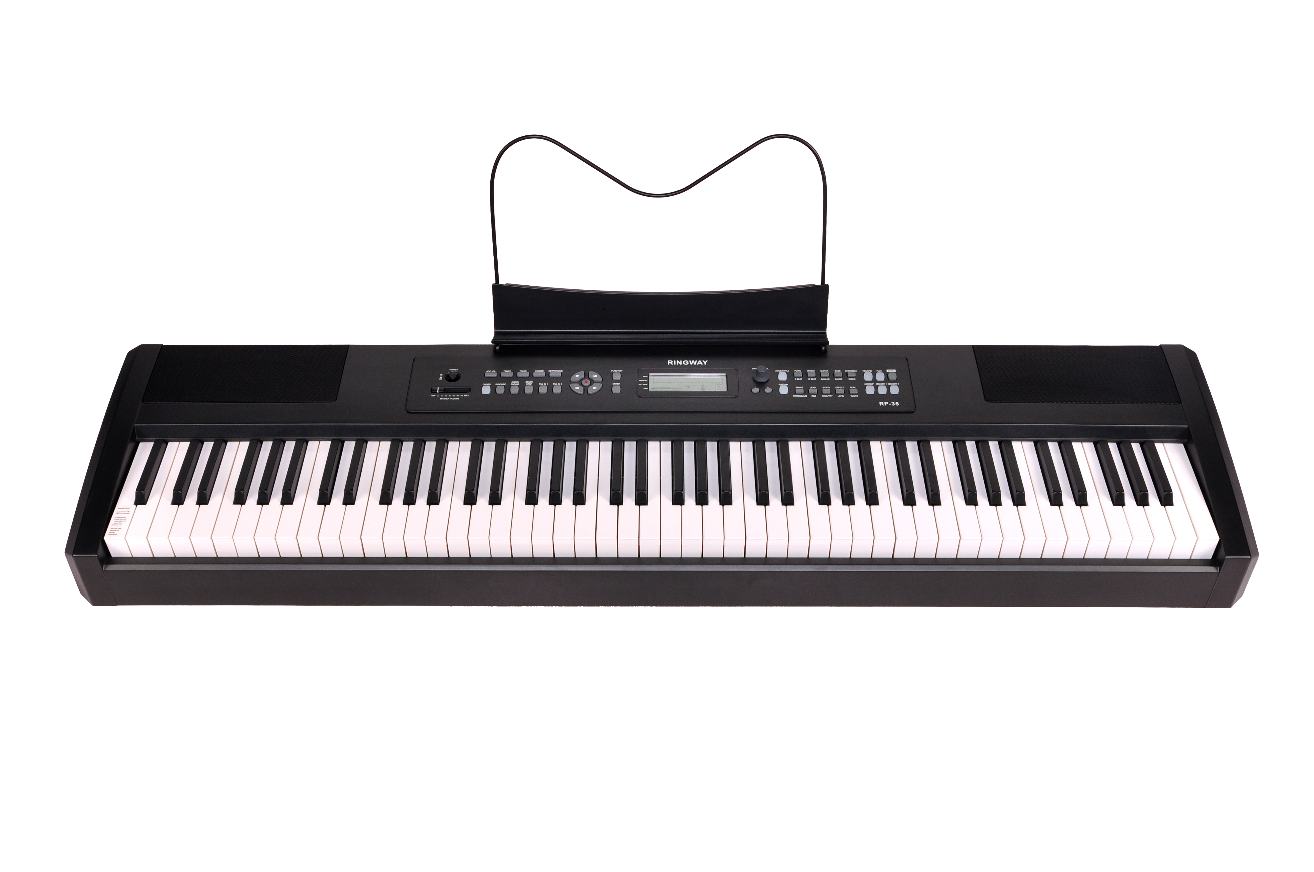 RP35 Teclado: 88 teclas HAMMER con respuesta al tacto. 64 notas de polifonía. Pantalla LED multifunción. Voces: 137 PCM + 8 kits batería + 1 efectos. Control de Voces: Volumen Sustain Afinador Transpositor Acordes División Efectos de Reverb y Chorus. Tres pedales. Incluye pedal Sustain. Dos pistas de grabación en tiempo real y playback. 10 canciones de demo. Tres medidas de sensibilidad. 4 x 4 registros de memoria. Ritmos: 100 estilos. Salida Auriculares Line Out L/R power DC12V. USB to HOST. MIDI OUT. Potencía RMS: 20 W. Medidas del cabezal: 1.143x515x310 mm. Peso del cabezal: 17 1 kgs.