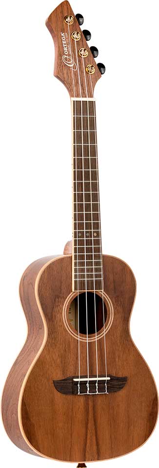 UKELELE CONCIERTO Ukelele de tamaño concierto con tapa, aros y fondo de nogal. Herrajes dorados. Funda incluida.