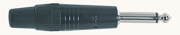 CONECTOR JACK Conector jack macho mono 6,3mm diámetro con cuello en latón niquelado y pasa cables en PVC hasta 7,5mm. de diámetro. Color negro.