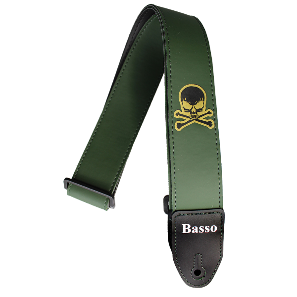 SF128 Correa para guitarra y bajo. Fabricado con material sintético (Vinyl tech) 100% reciclable. Con ajuste de triple deslizamiento. Extremos sintéticos (Vinyl tech). 5 cm. de ancho. Ajustable de 85 cm. a 150 cm. Verde calavera.