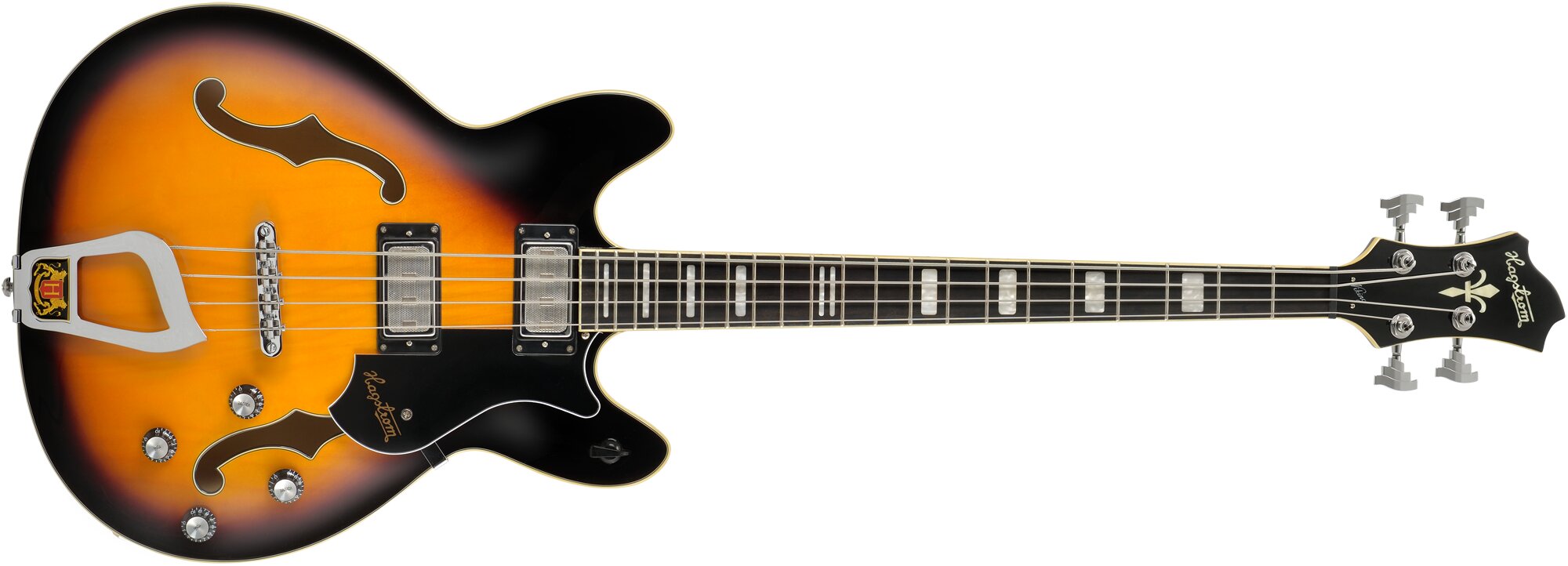 BAJO DE 4 CUERDAS ‘Viking Bass – Tobacco Sunburst, Contoured Ply-Maple Semi-Hollow body, Maple Set-Neck, Long throw T-O-M Bridge, Hagstrom Trapeeze, 2 x Hagstrom Dyna Rail Alnico 5, Mesh Covered Pickups, 2 x Vol, 2 x Tone, 6-Way Rotary Pickup Selector, Scale Length 30.75», H-Expander Truss Rod, 22:1 Hagstrom Tuners, Resinator Fretboard’