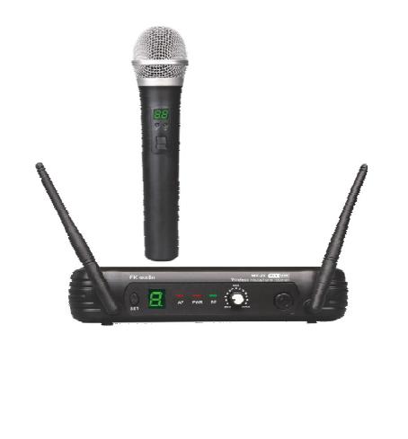 Micrófono Inalámbrico de mano EK audio Sistema WR-25 UHF SISTEMA DIVERSITY Con pantalla de información LED Salida XLR equilibrado y salida de 1/4 no balanceadas. Con tecnología de control sintetizada PLL. 8 canales UHF seleccionables. RECEPTOR WR-25 Gama de frecuencia: 460-970MHz Sensibilidad de recepción: -105dBm Radio señal / ruido: -105dB Borde al rechazo de canal> 70 dB Distorsion Armónica Total (THD): <1% Nivel de salida: 0-300mV Alimentación: 13-15V DC nominal 300mA Dimensiones: 17 5 x 13 5 x 4 3 cm. 1 MICRÓFONO DE MANO HT-25 Salida de RF:> 10dBm. Tipo de modulación: FM. Desviación máxima: ± 40KHz. Emisión espuria: > 55dBc. Drenaje de corriente nominal: <40mA. Alimentación: 2 x 1 5 V AA. Dimensiones: 23 5 x 5 x 5 cm.